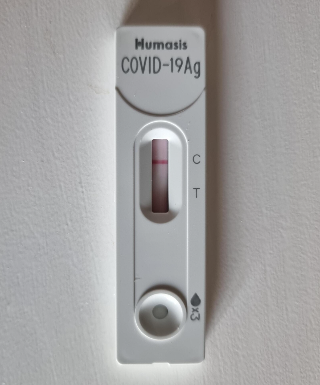 C에 한 줄이 생겨야 음성이다. C와 T에 흐릿하게라도 각 한 줄씩 총 두 줄이 생기면 코로나 바이러스 감염 가능성이 있으니 선별검사소로 가서 확인해야 한다. T만 빨간 줄이 나오고 C에 빨간 줄이 안 생기면 검사를 잘 못한 것으로 무효이다. 2시간 뒤 혹시 결과가 바뀌나 확인했는데 동일하다. 다 끝나면 모두 비닐에 버린다.