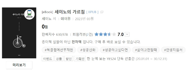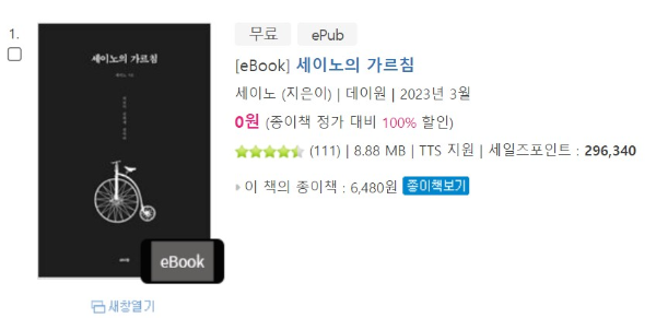안구건조증으로 못 읽고 있다가, 다른 책을 구입할 일이 있어서 들어가 보니 이북이 0원이다. 이북은 예스 24 e-book앱을 이용 중이어서 예스 24에서 다운을 받았다.