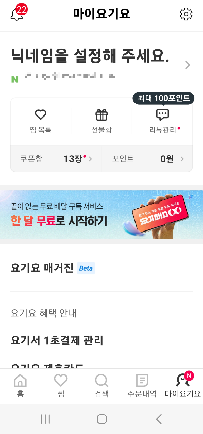 해지는 요기요앱에서 하단의 [마이요기요] 메뉴에서'한 달 무료로 시작하기'라고 쓰여있는 배너에 해지하는 메뉴가 위치해 있다. 나는 지금 1달이 지난 상태여서 다시 광고 화면으로 바뀌어 있다.