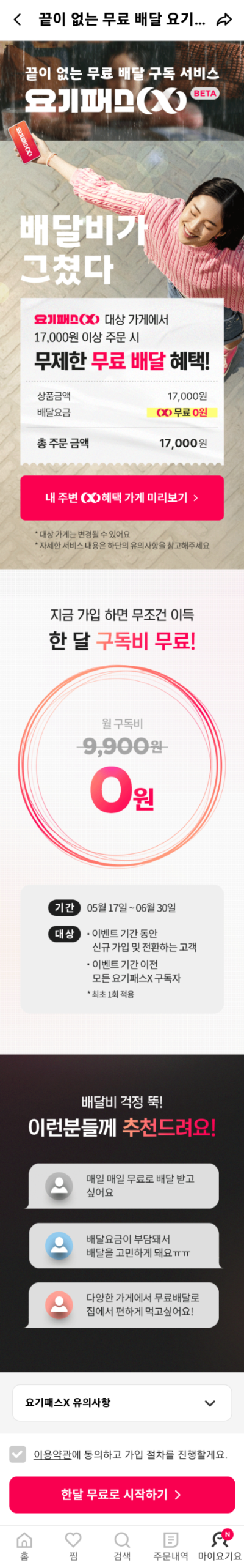 5월 말쯤에 또 이용해볼까해서 들어가 보니 요기패스가 바뀌었다. 9,900원은 똑같지만, 17,000원 이상 주문하면 무료배달이 무제한이라고 한다. 12,000원~15,000원 사이로 주문을 하곤 했는데, 17,000원이면 좀 애매하지만 무료라니 사용을 해보았다. 지난번에도 최초 1회 무료였는데, 이번에 바뀌어서 그런지 또 무료 1달이 적용이 되었다.
