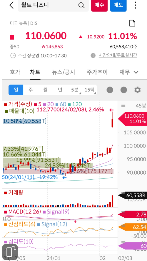 디즈니가 몇 년간 마이너스였는데, 빨간색으로 + 가 되었다. 어제 마침 11.01% 상승하며 매수가 평균을 넘어섰다. 무슨 일이 있었나?
