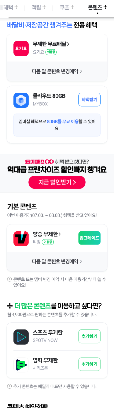 멤버십 화면에서 콘텐츠를 선택할 수 있다. 티빙을 먼저 선택하고 나서 아래에 보니 '요기요' 구독이 또 있다. 둘 중 하나인가 싶었지만, 그냥 한 번 요기요를 클릭해 봤다. 두 개 모두 선택된 듯한 모습이다.