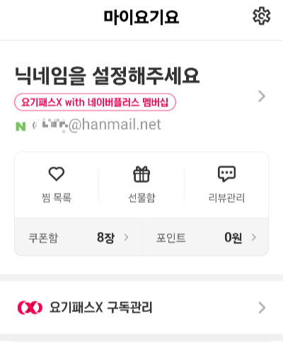 그래서 요기요 앱을 열어봤다. 위에 진홍색으로 '요기패스X with 네이버플러스 멤버십'이 쓰여있다. 아무것도 안 해도 자동연결이 되었다. 지금은 기억이 안 나지만 요기요에 한메일로 가입했던 것 같다. 핸드폰 번호로 매칭인가? 암튼 되었다.